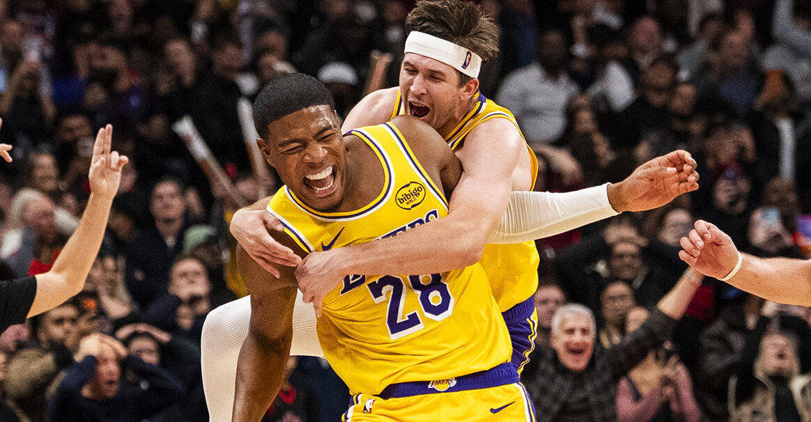 北京时间12月5日,洛杉矶湖东谈主在客场以123-120险胜多伦多猛龙,奥斯汀-里夫斯在要道时间冲破上篮扳平比分,随后八村垒轰进压哨三分绝杀。