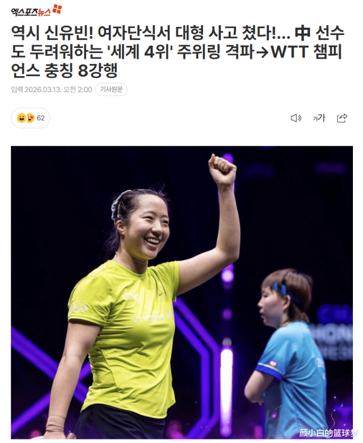 这场比赛后韩乒一姐申裕斌登上了韩媒热搜榜第一的位置,因为这场比赛关于韩国乒乓球界来说好奇热爱好奇热爱要紧,朱雨玲是前寰球第一亦然现役女单寰球第四。